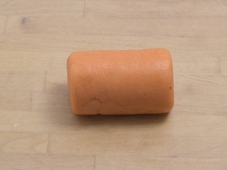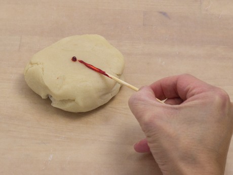 1. Diviser et colorer la pte d'amande en mettant une à deux gouttes de colorant alimentaire en gel à l'aide d'un cure-dent (optionnel). Pétrir la pte jusqu'à ce que la couleur soit uniforme. Rouler en un cylindre de 1.5 à 2 pouces (3.8 à 5 centimètres) de diamètre. Couper cinq rondelles de ? pouce (3 millimètres).