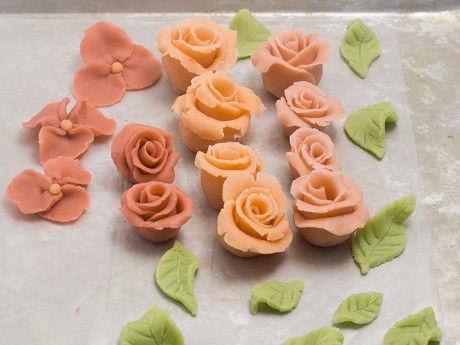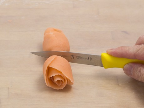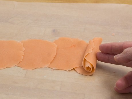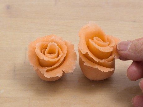 3. Décoller délicatement les pétales du papier ciréet les étendre en les chevauchant. En partant du premier pétale que vous avez étendu, rouler en un tube. Appuyer au centre du tube de façon à créer deux roses et couper à l'aide d'un couteau. Ouvrir délicatement les pétales pour que les roses paraissent plus réalistes. Répéter selon le nombre de couleurs et de roses désirées. Réserver.