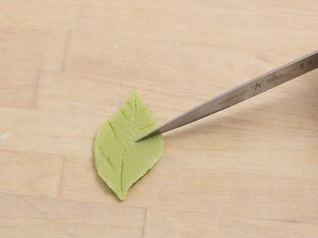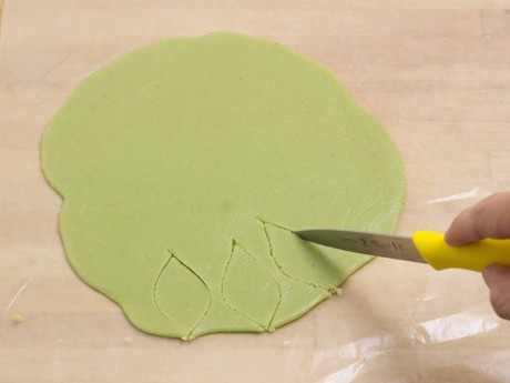 4. Colorez une petite quantitéde pte d'amande en vert comme indiquéci-dessus. Rouler entre deux feuilles de papier ciréà une épaisseur de ? pouce (3 millimètres). Couper plusieurs feuilles à l'aide de la pointe d'un couteau puis tracer les nervures. Pour faire les tiges de vignes, rouler en un tout petit rouleau et enrouler autour d'un objet long et mince comme un pic à brochette. Déposer sur plaque à biscuit. Réserver.